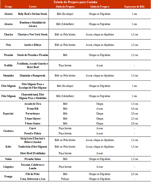 Leve o bife à chapa ou frigideira de acordo com as instruções de preparo e espessura de bife indicadas na tabela acima.